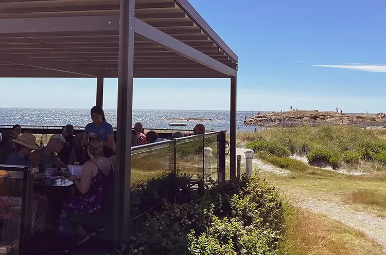 Havsnära matglädje. Restaurang, glass och bar precis vid havet på Getterön 5:e vik. Avslappnad stämning, god mat och svalkande drinkar hela sommaren lång för både stora och små sällskap.